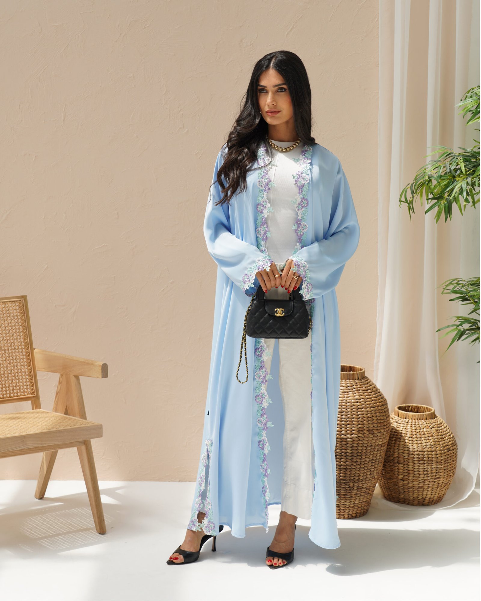 Ciel Abaya – A Sky Blue Summer Abaya with Delicate Floral Lace