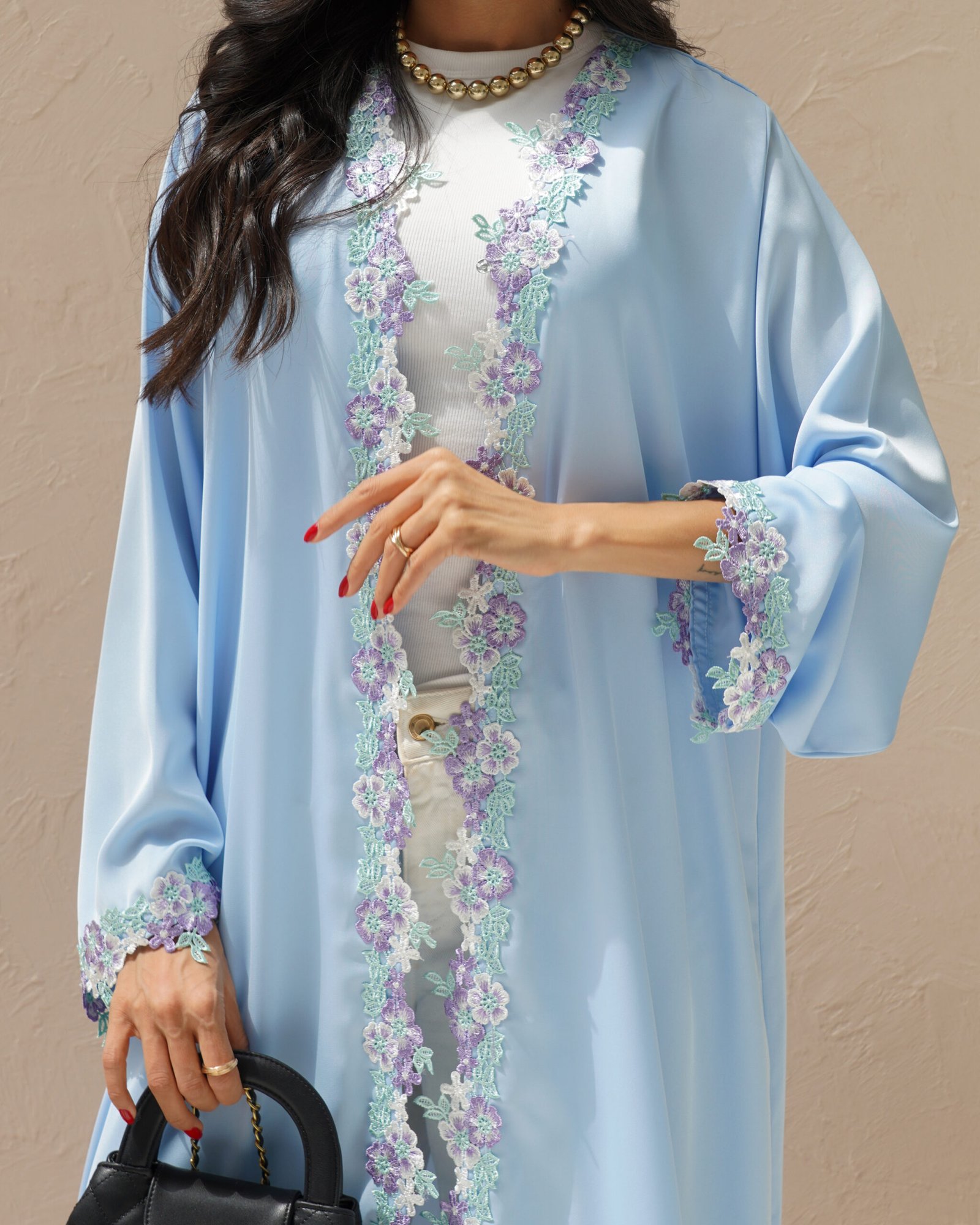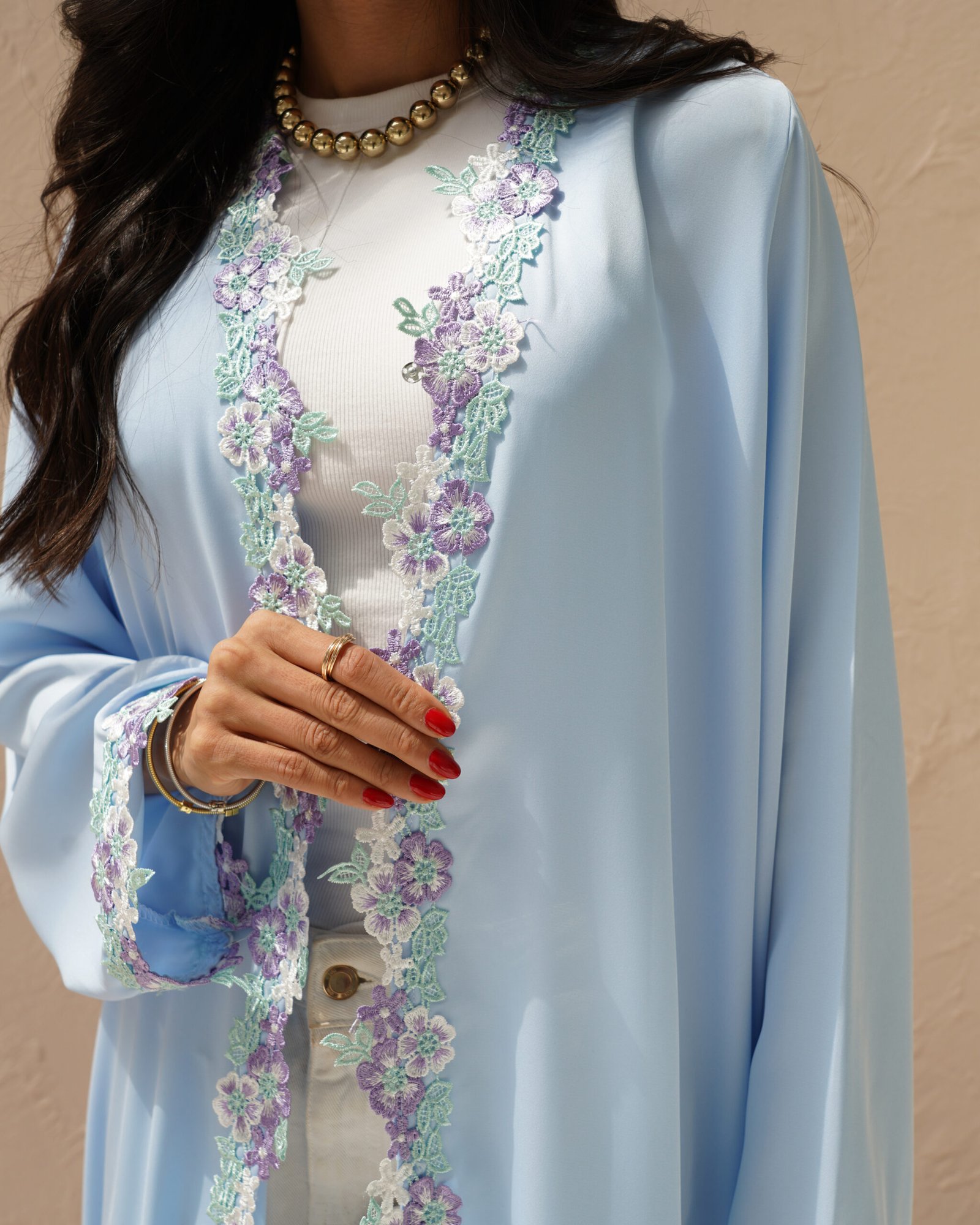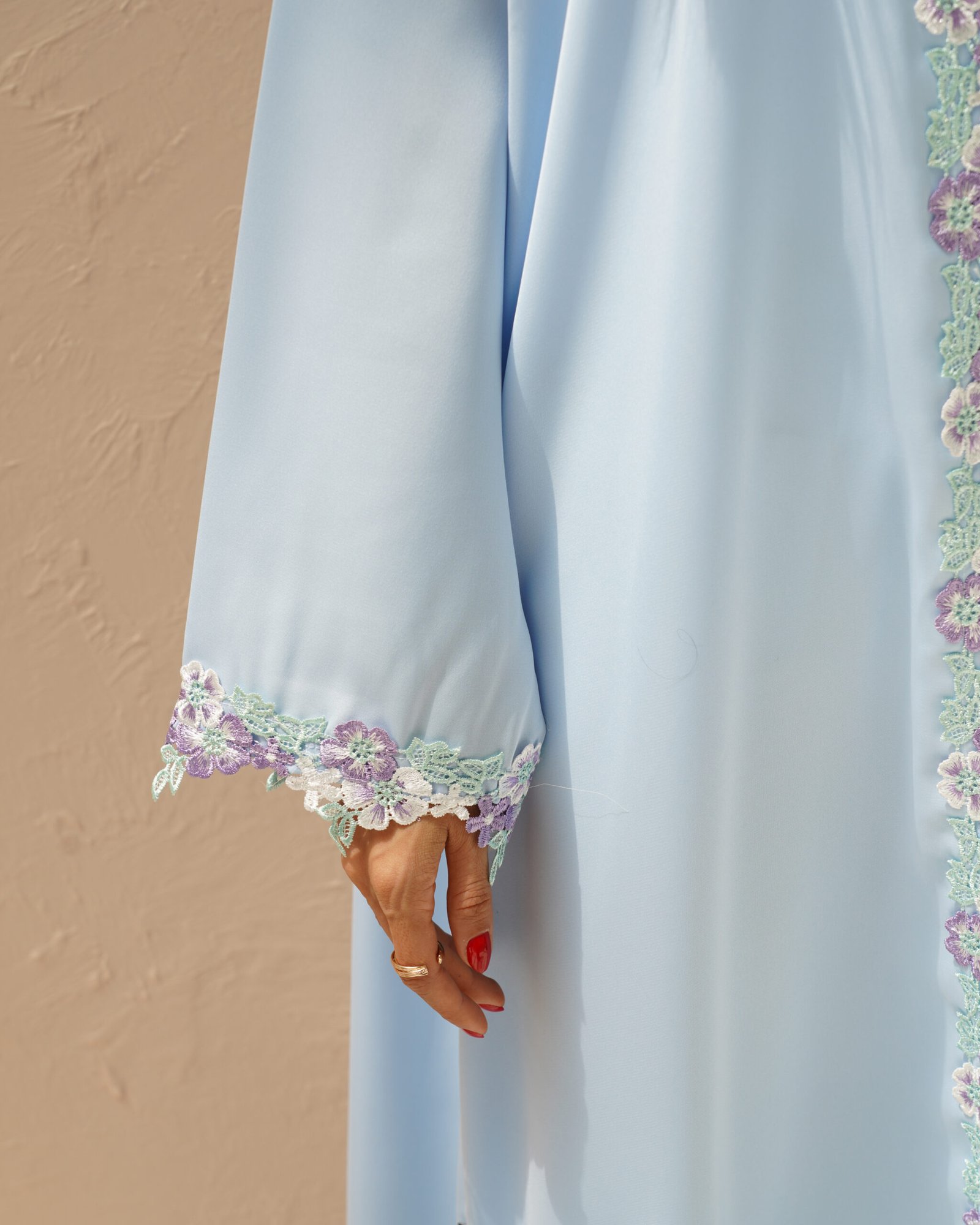 What makes the Ciel Abaya special is the detail. Delicate floral lace runs down the front opening, trims the sleeve cuffs, and decorates the side slits. The flowers are done in lilac, mint green, and white — a soft color mix that sits beautifully on the sky blue base. The lacework has a 3D, textured feel, adding a little something extra without taking away from the calm look of the abaya.