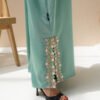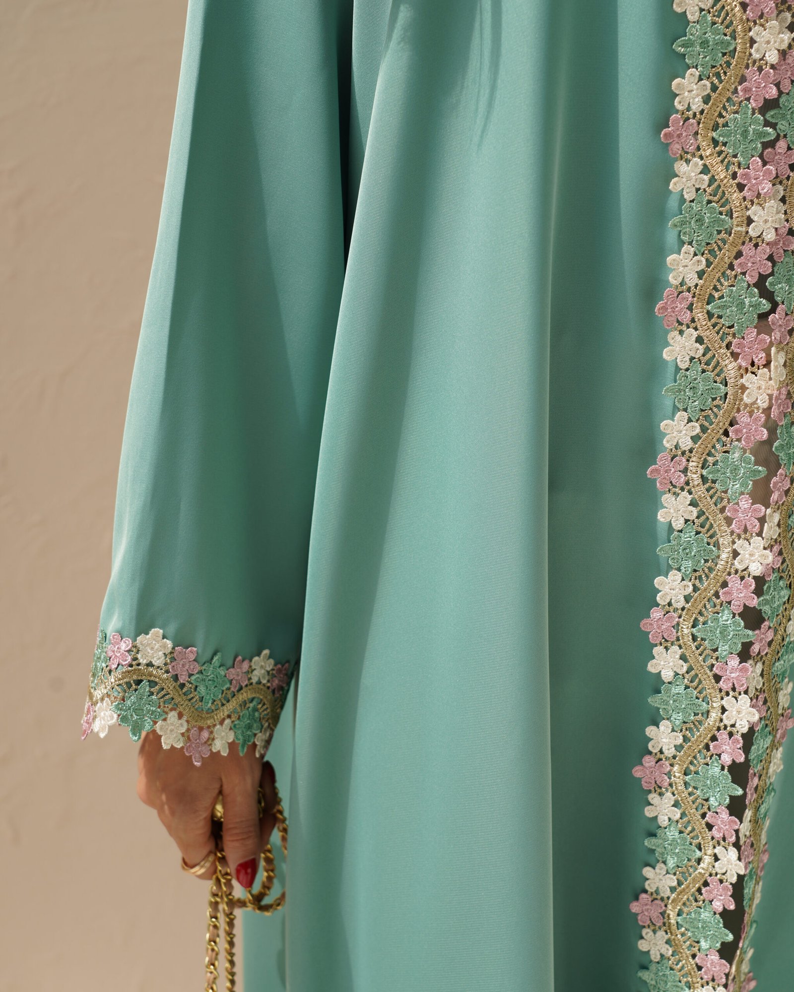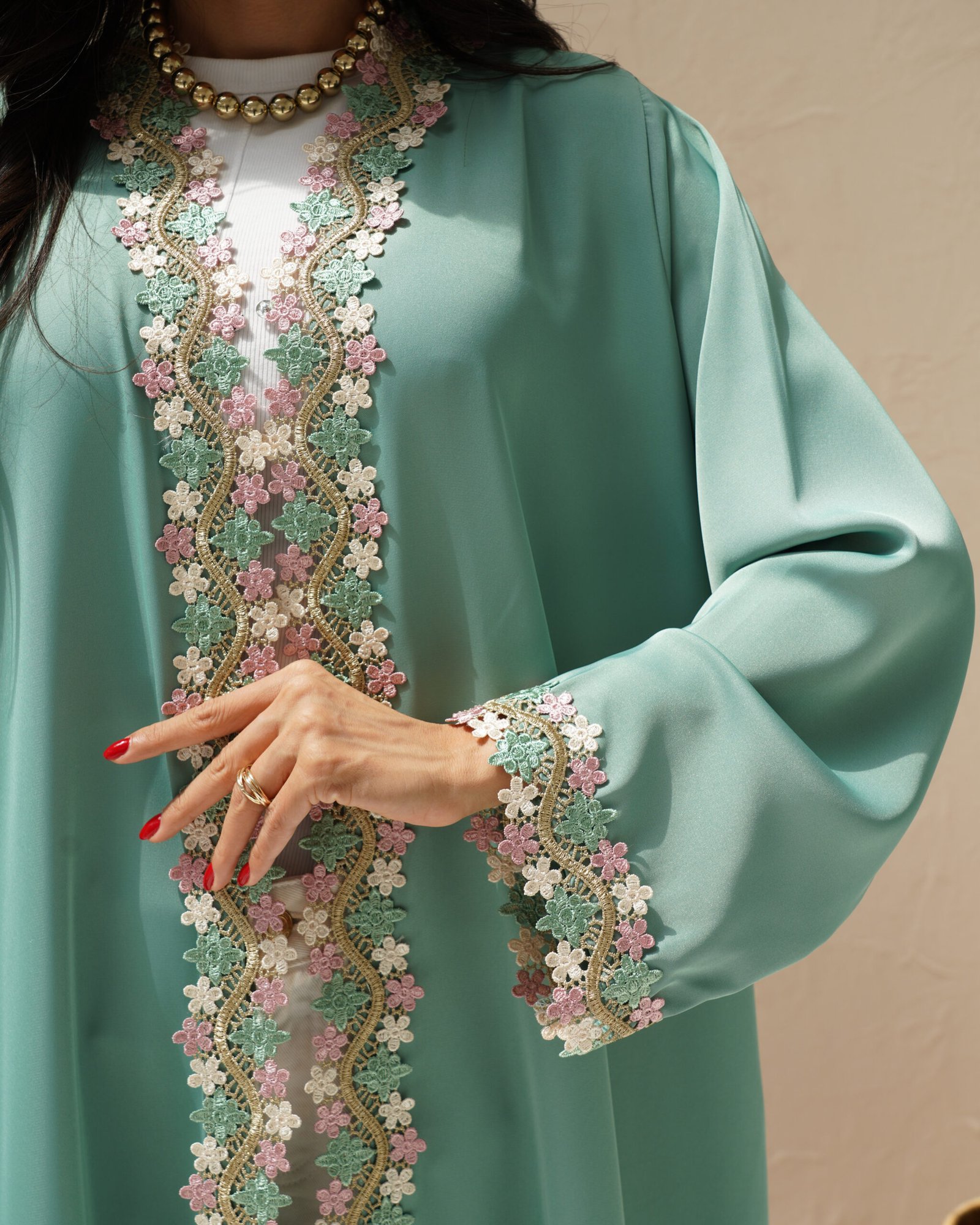 A soft mint green summer abaya with pink and gold wavy floral lace along the front, cuffs, and side slits. Includes a matching Sheila.