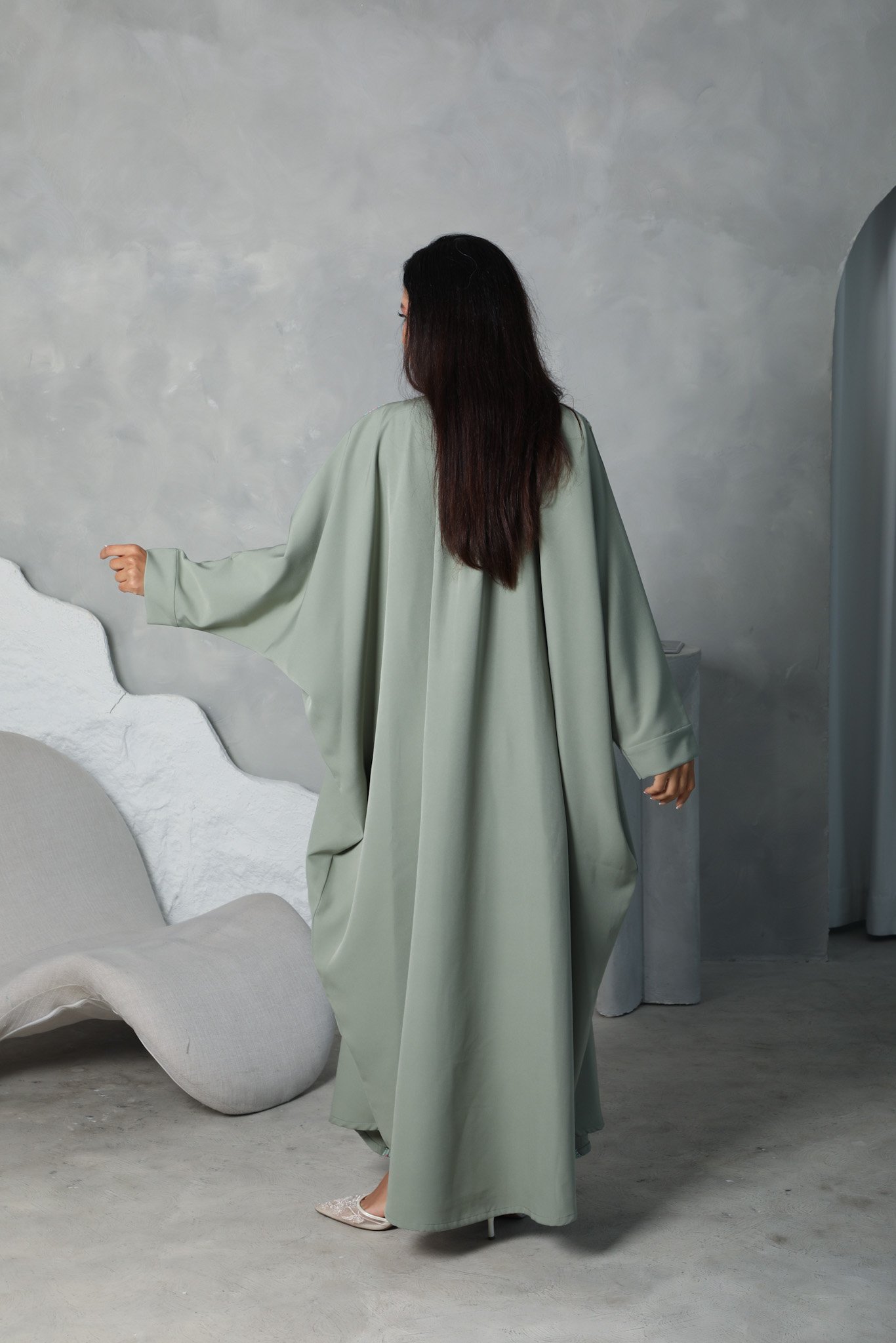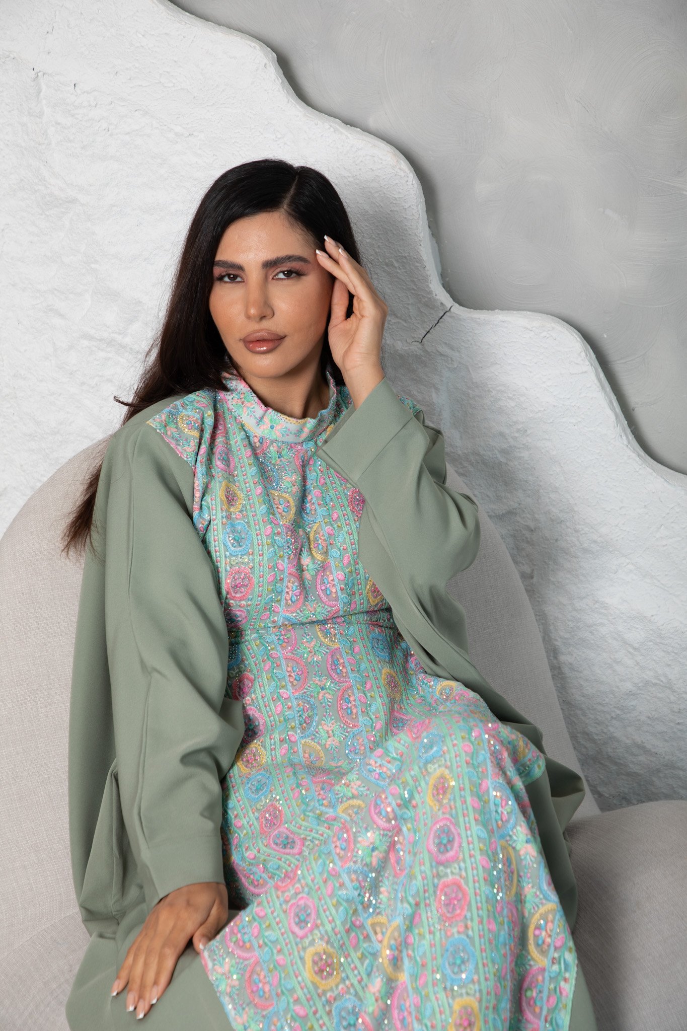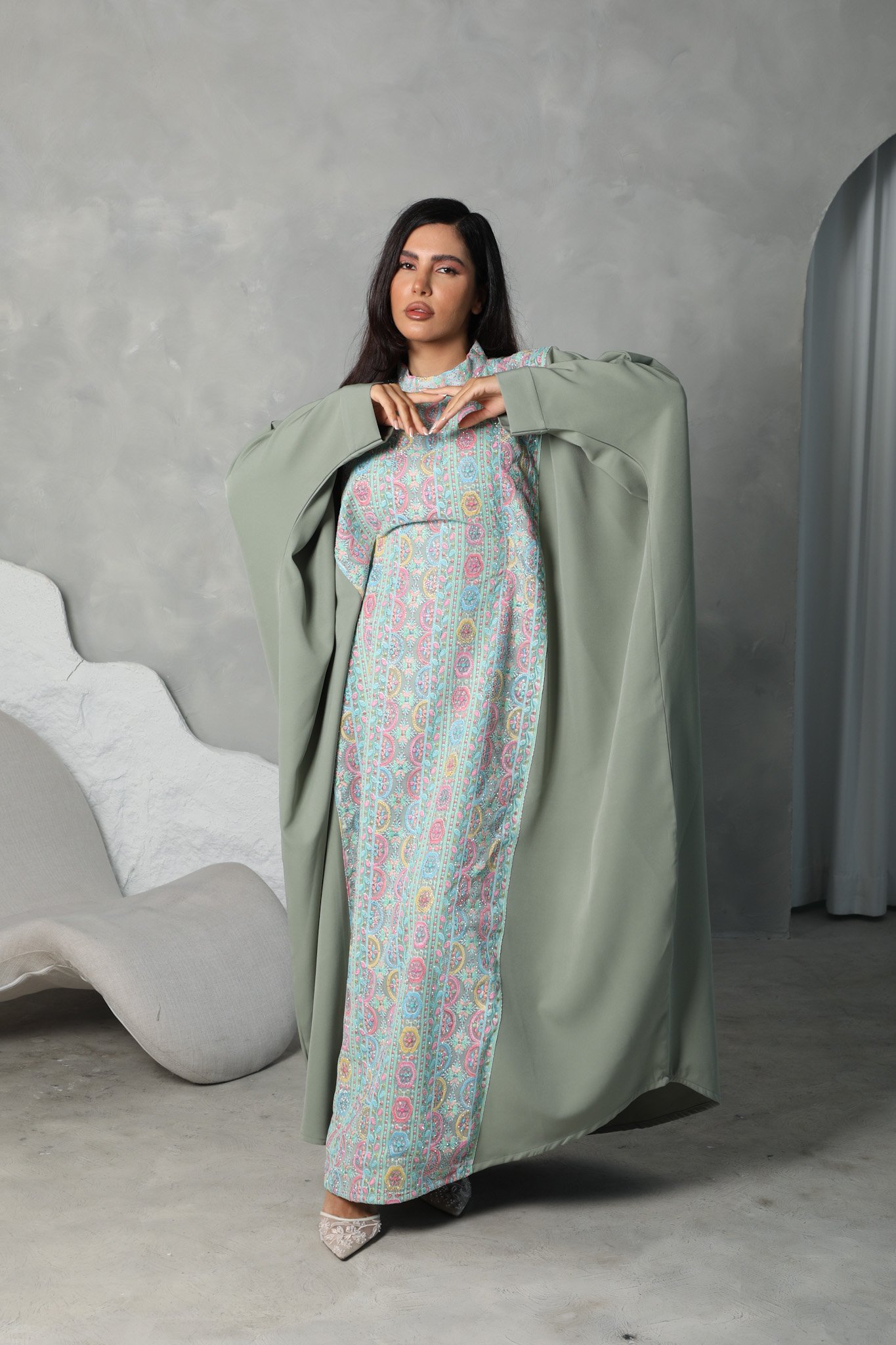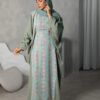 A flowy one-piece Jalabiya made from premium Crepe fabric, featuring a soft printed design, hidden waist belt, and matching scarf.