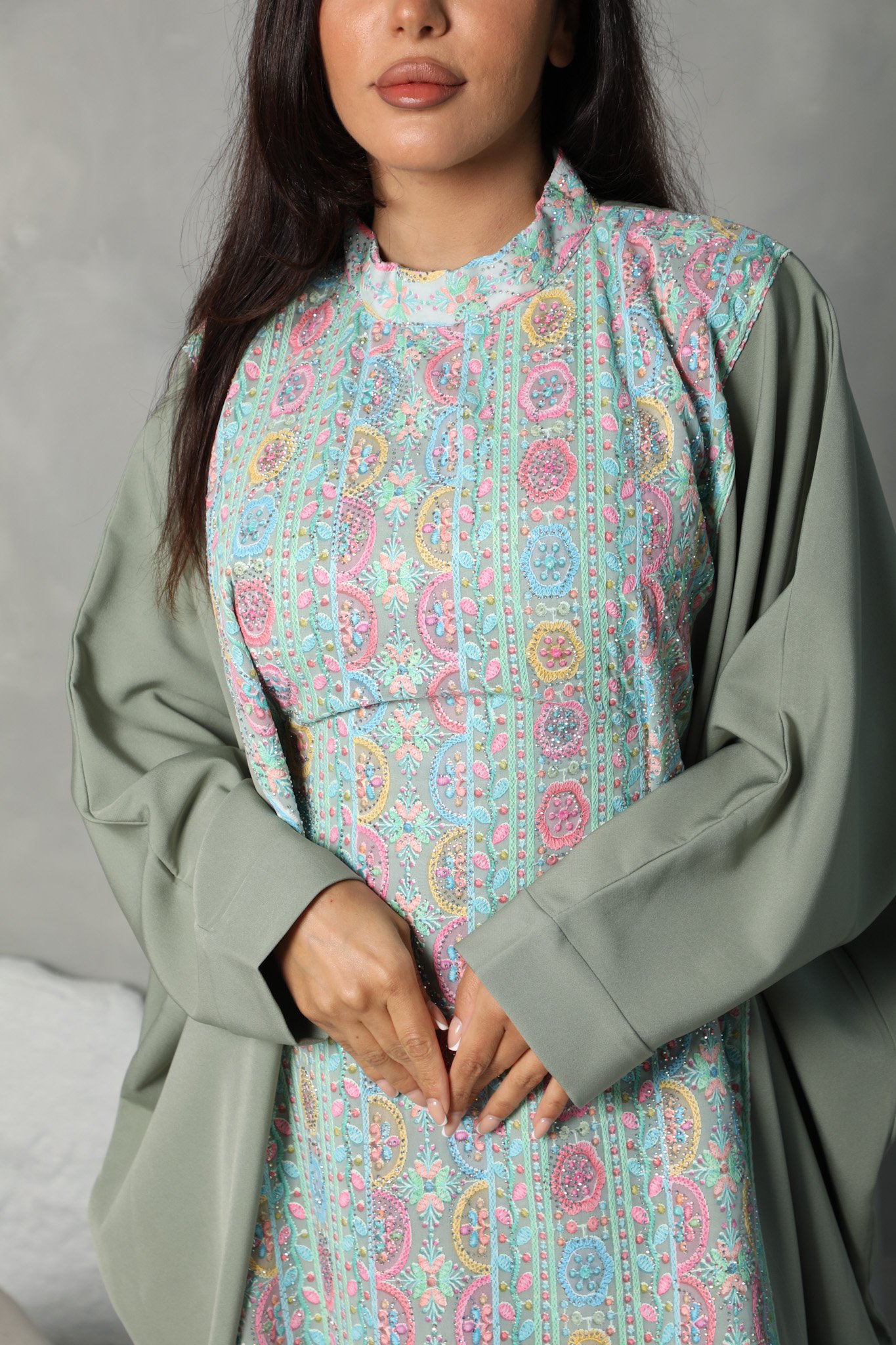 Nour Jalabiya is crafted from high-quality Crepe fabric, known for its smooth texture and graceful drape. The design features a printed front panel sewn directly into the dress, giving it a layered look while keeping it a single, seamless piece. Inside, a hidden waist belt made from the same fabric and color allows you to gently tighten the dress from within—shaping the waist without changing the outer look. With its wide sleeves, soft flow, and included matching scarf, Nour Jalabiya is a modest and comfortable choice for everyday wear, home gatherings, or relaxed occasions.