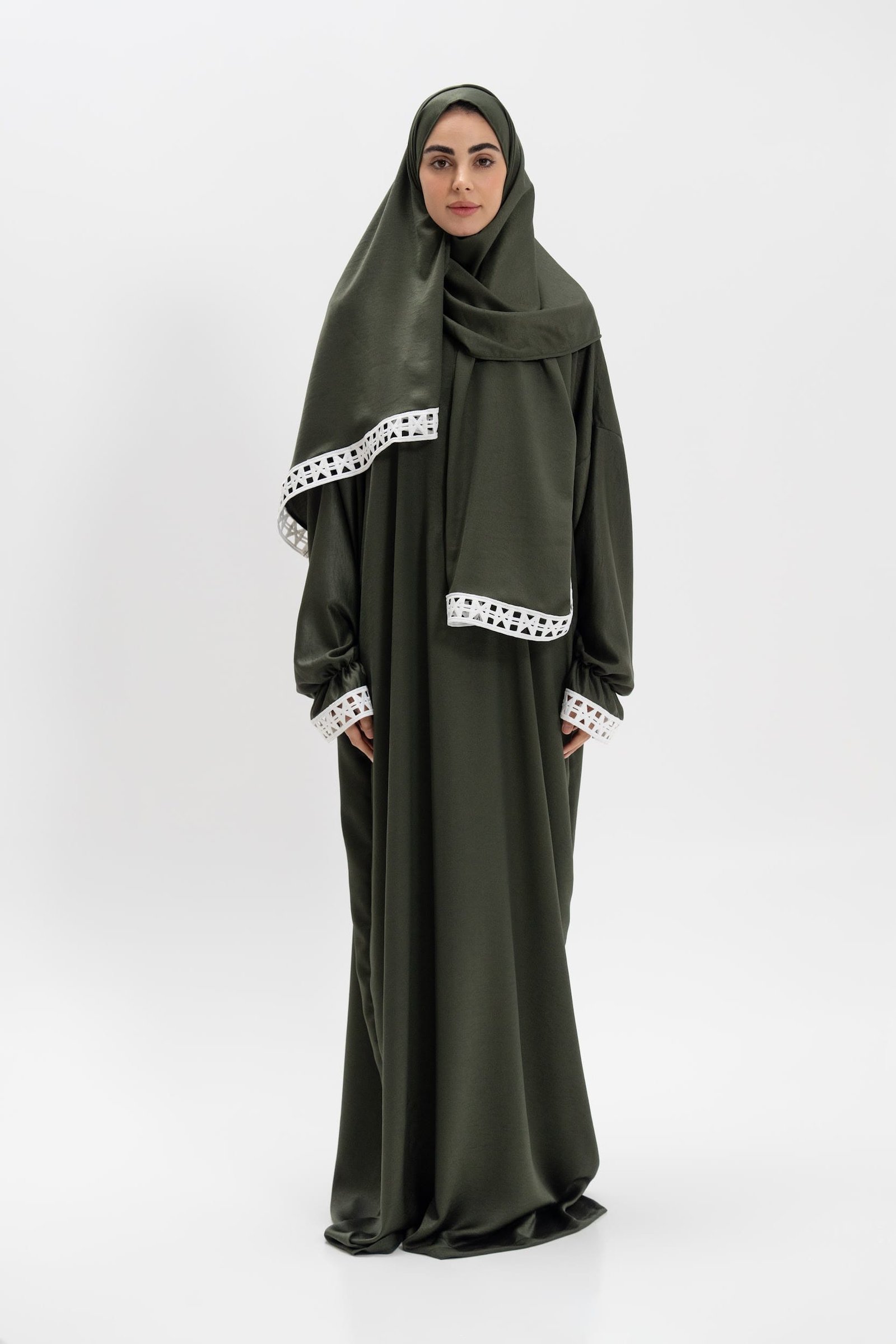 Luxurious full-coverage prayer dress in Mysore silk. Features attached hijab, durable zipper, and Islamic patterns. Combines modesty with elegance for your spiritual moments.