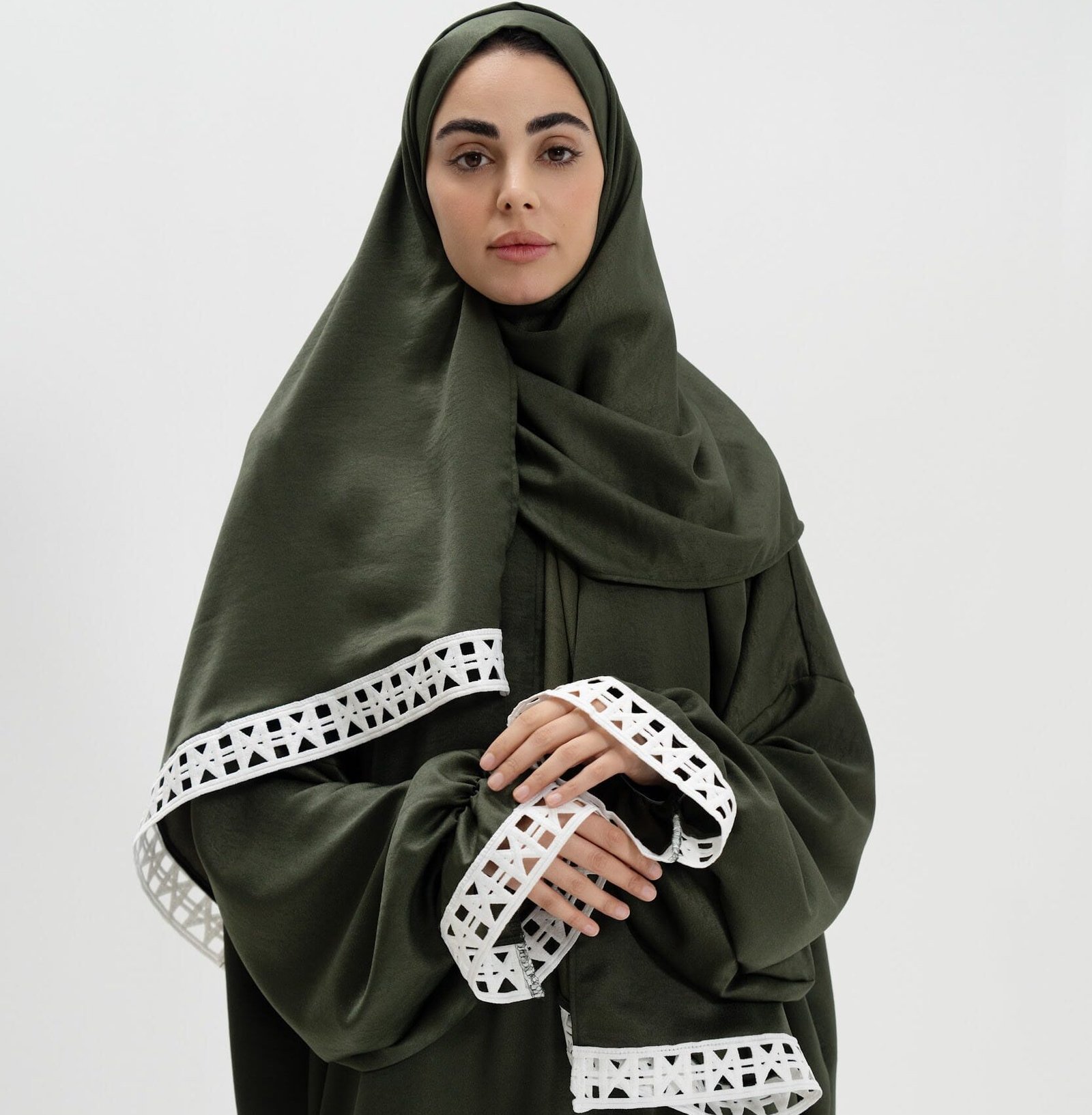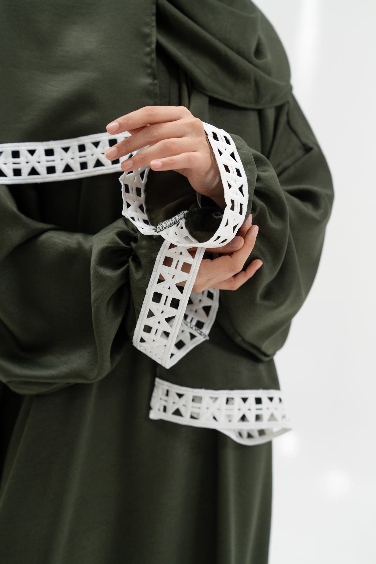 The dress features an attached hijab for convenience and a reliable Japanese zipper system. Traditional Islamic geometric patterns adorn the fabric, while practical elements like reinforced seams, weighted hems, and hidden pockets enhance functionality.