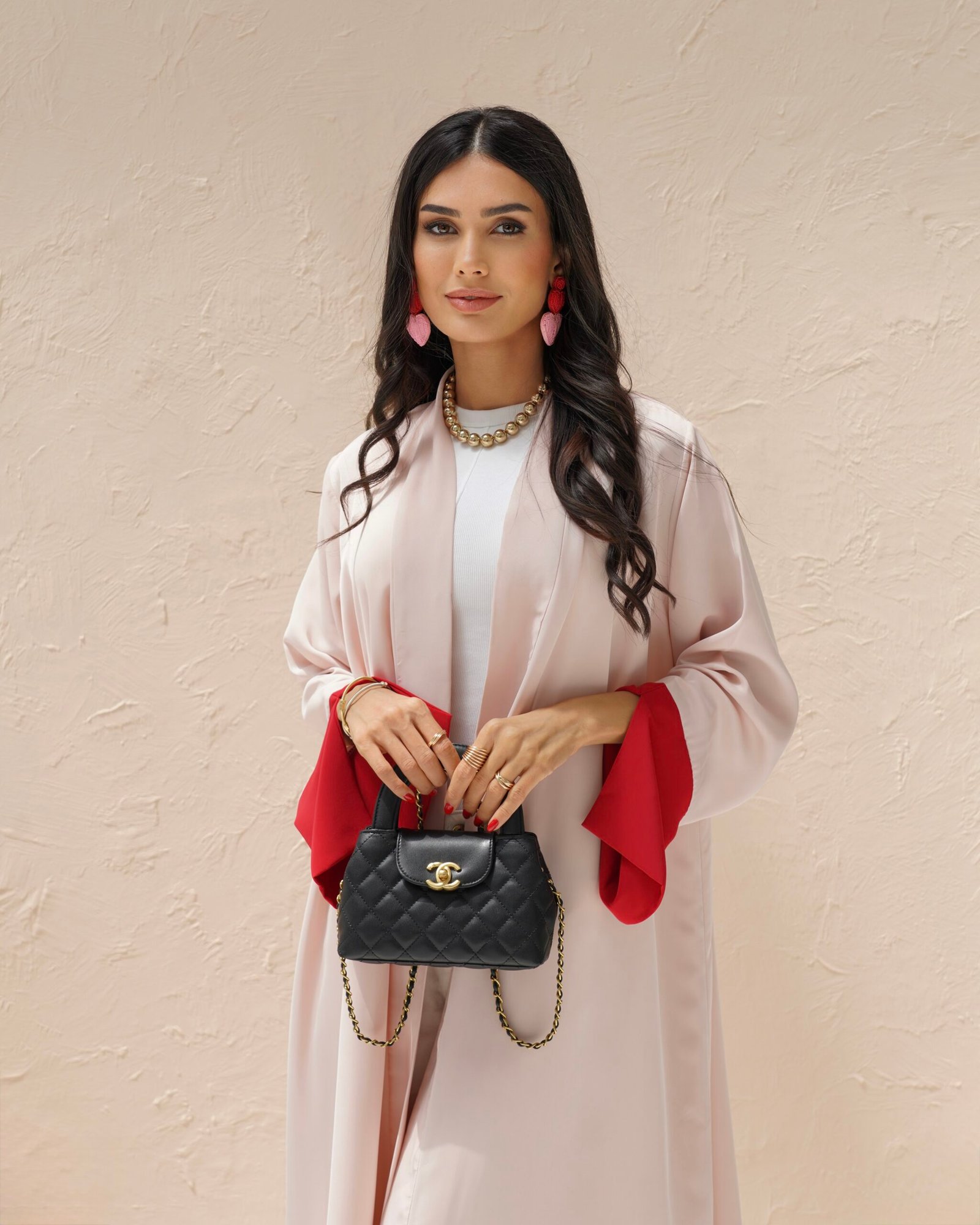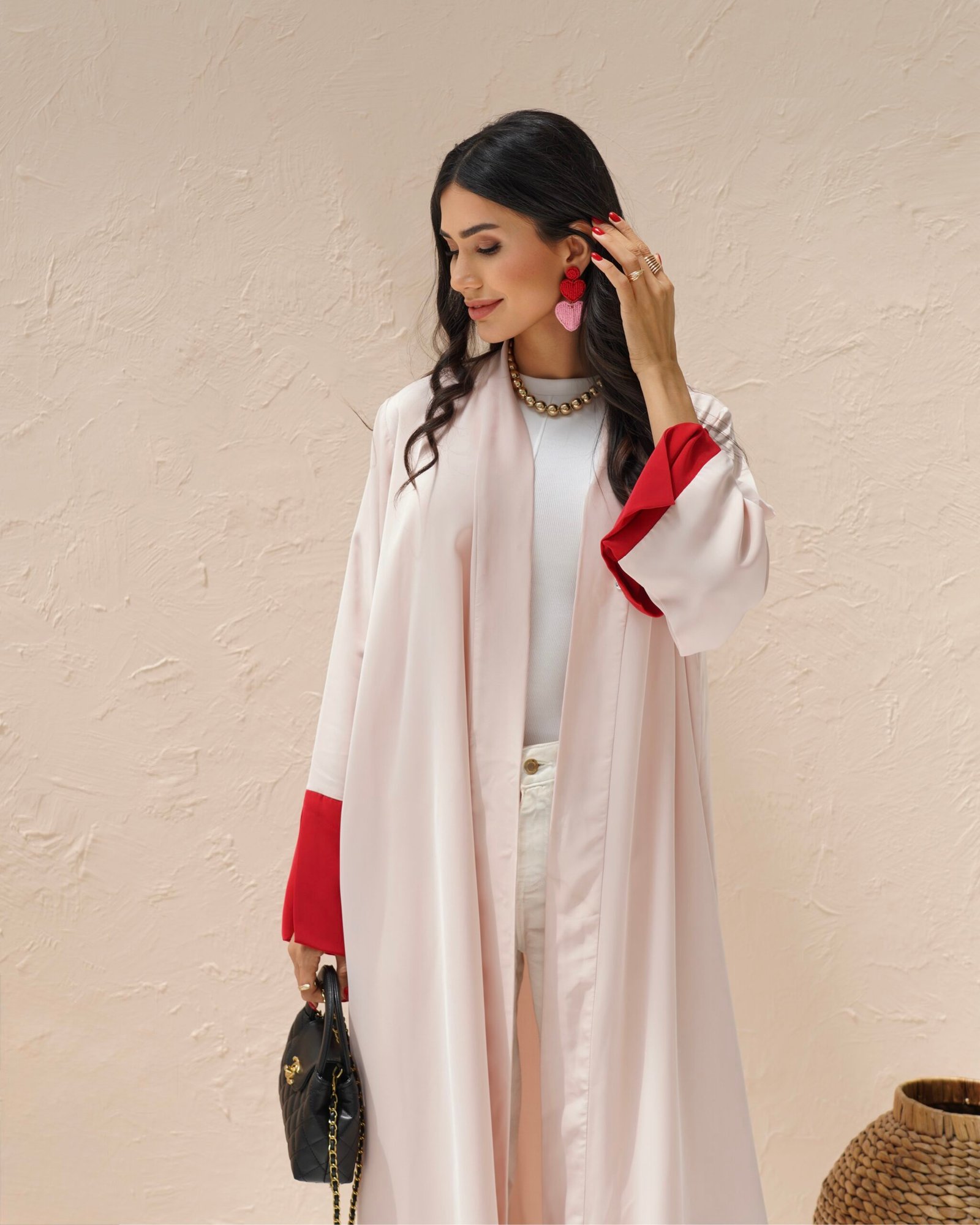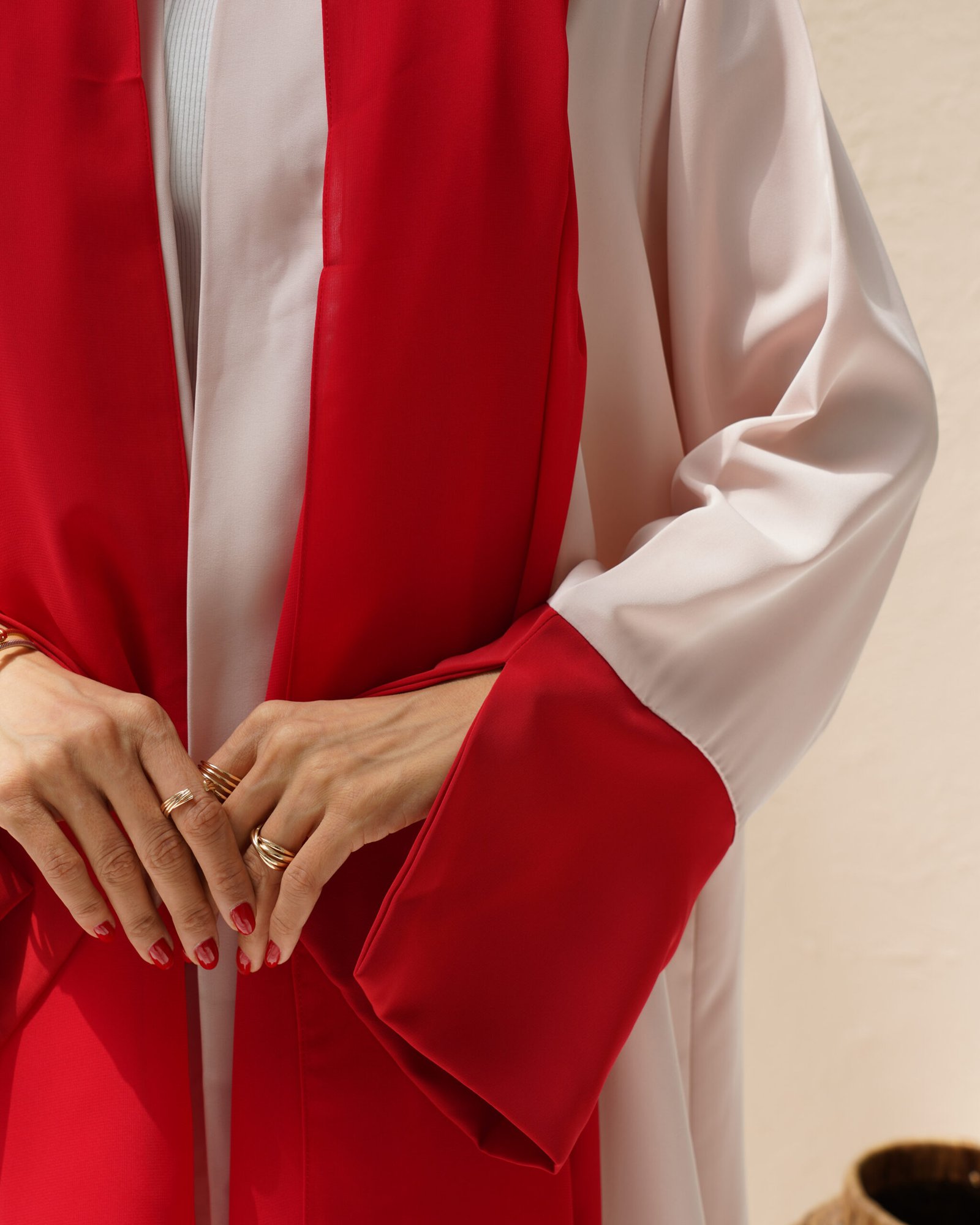 What really sets the Ruby Abaya apart is the color play. The blush pink body is paired with deep red panels running down the front opening and on the sleeve cuffs. The contrast is strong but balanced — the pink keeps the overall feel soft, while the red adds character and a bit of boldness. There's no embroidery or print, just clean lines and confident color. It's modest fashion with a modern edge.