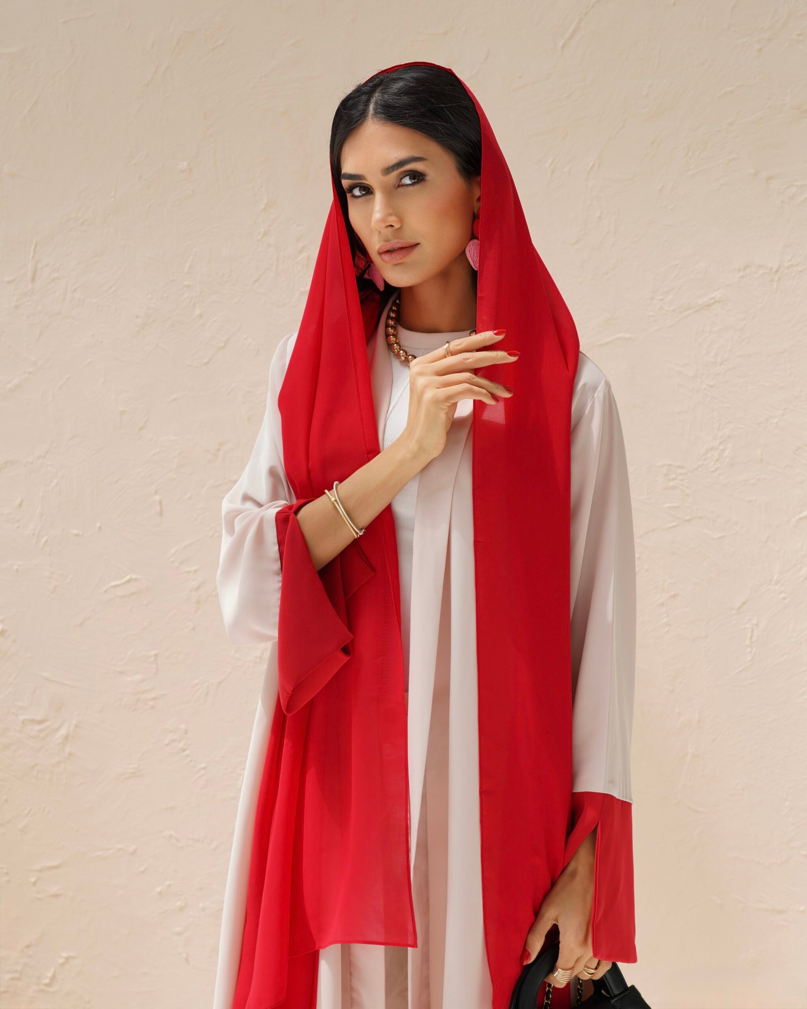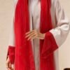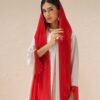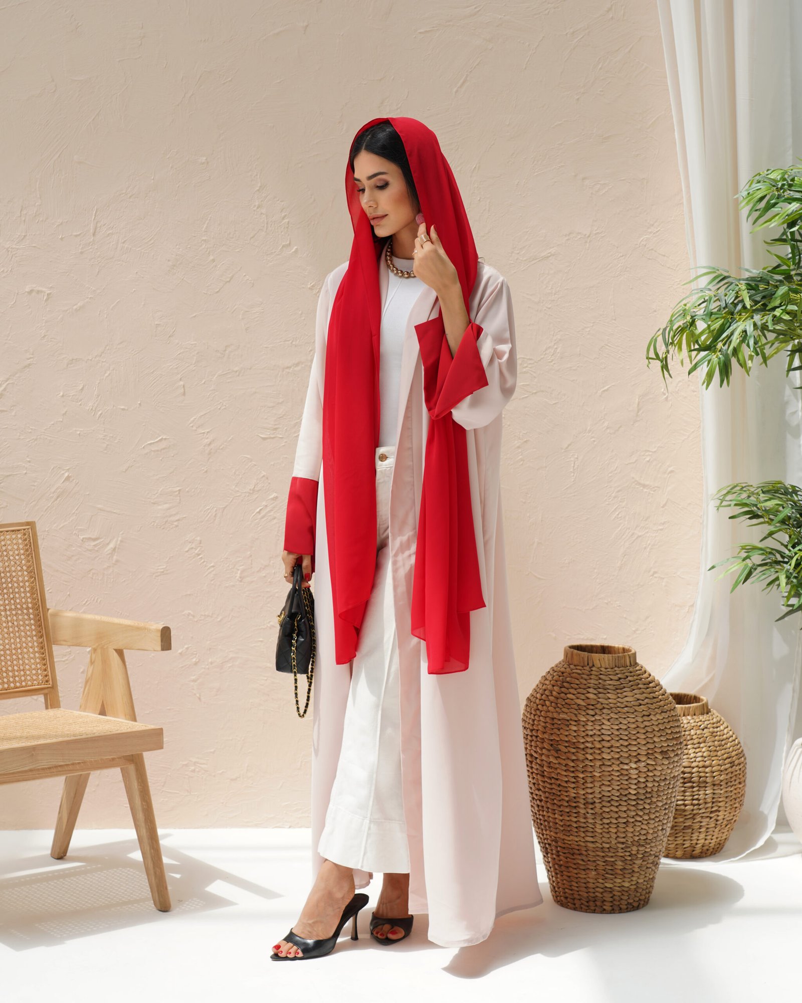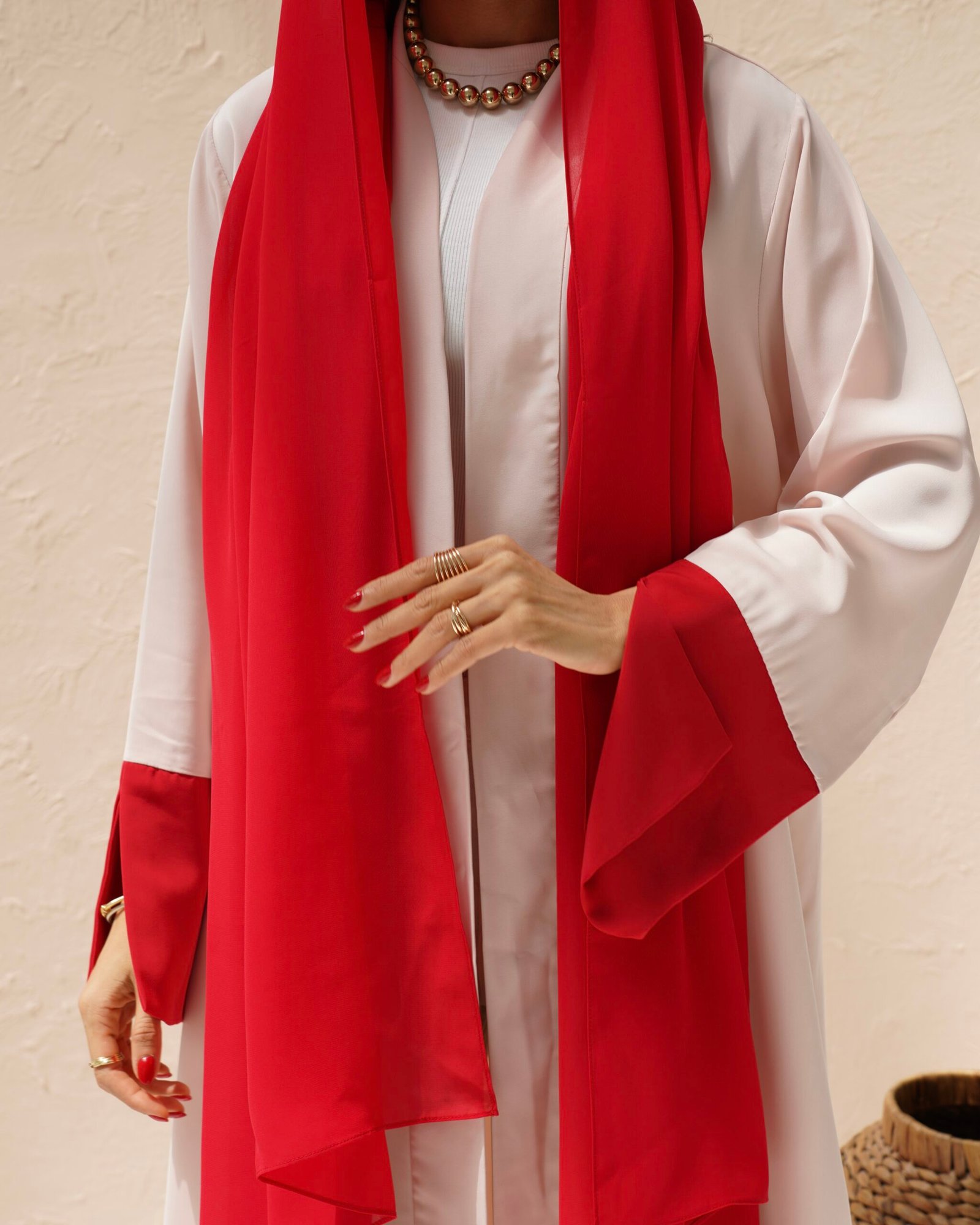Every Ruby Abaya comes with a matching Sheila in the same bold red shade. The scarf drapes beautifully and ties the whole look together — the red framing your face balances out the blush pink body of the abaya. Having the matching Sheila also makes styling simple, since the full look is already coordinated for you.