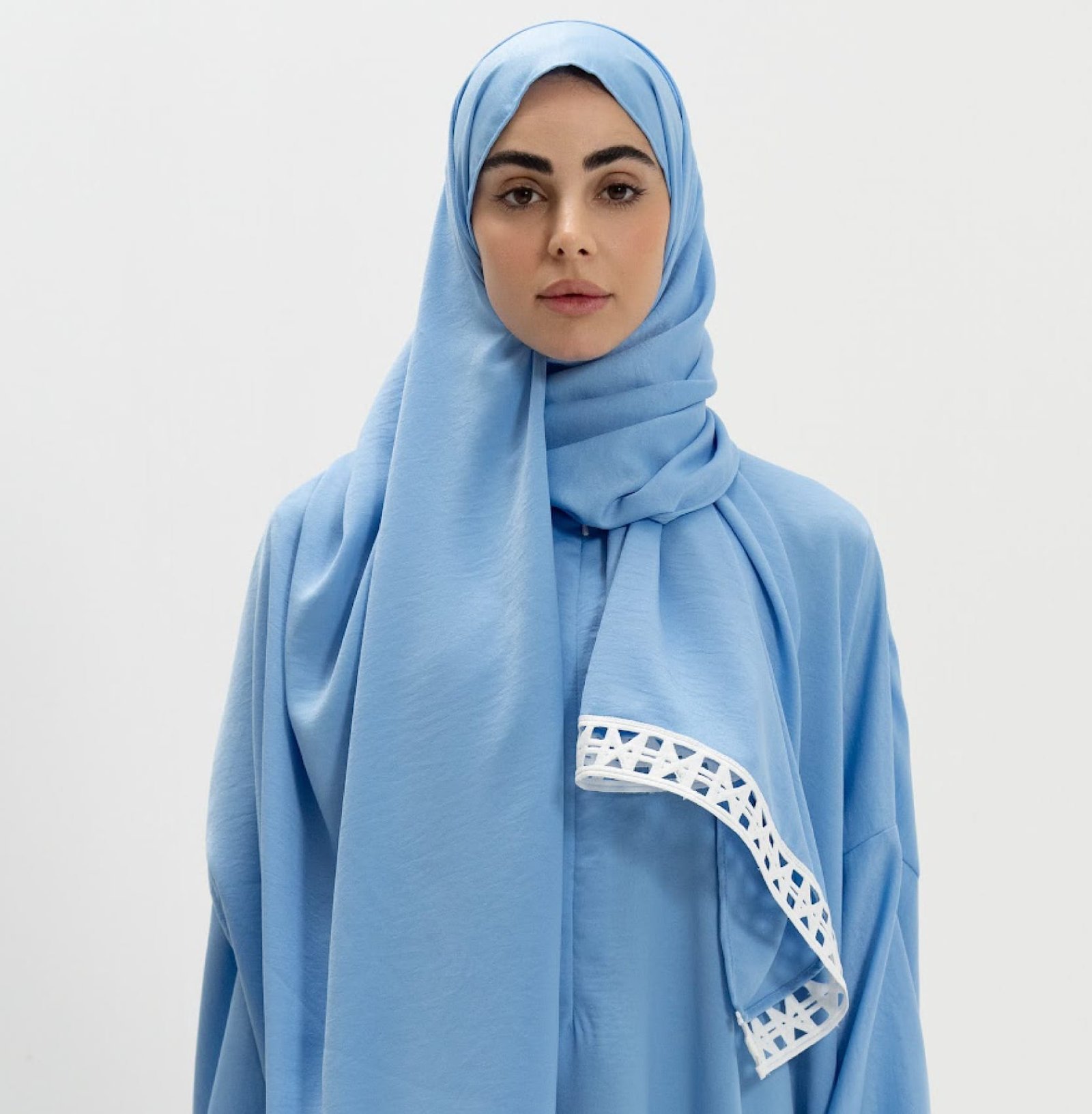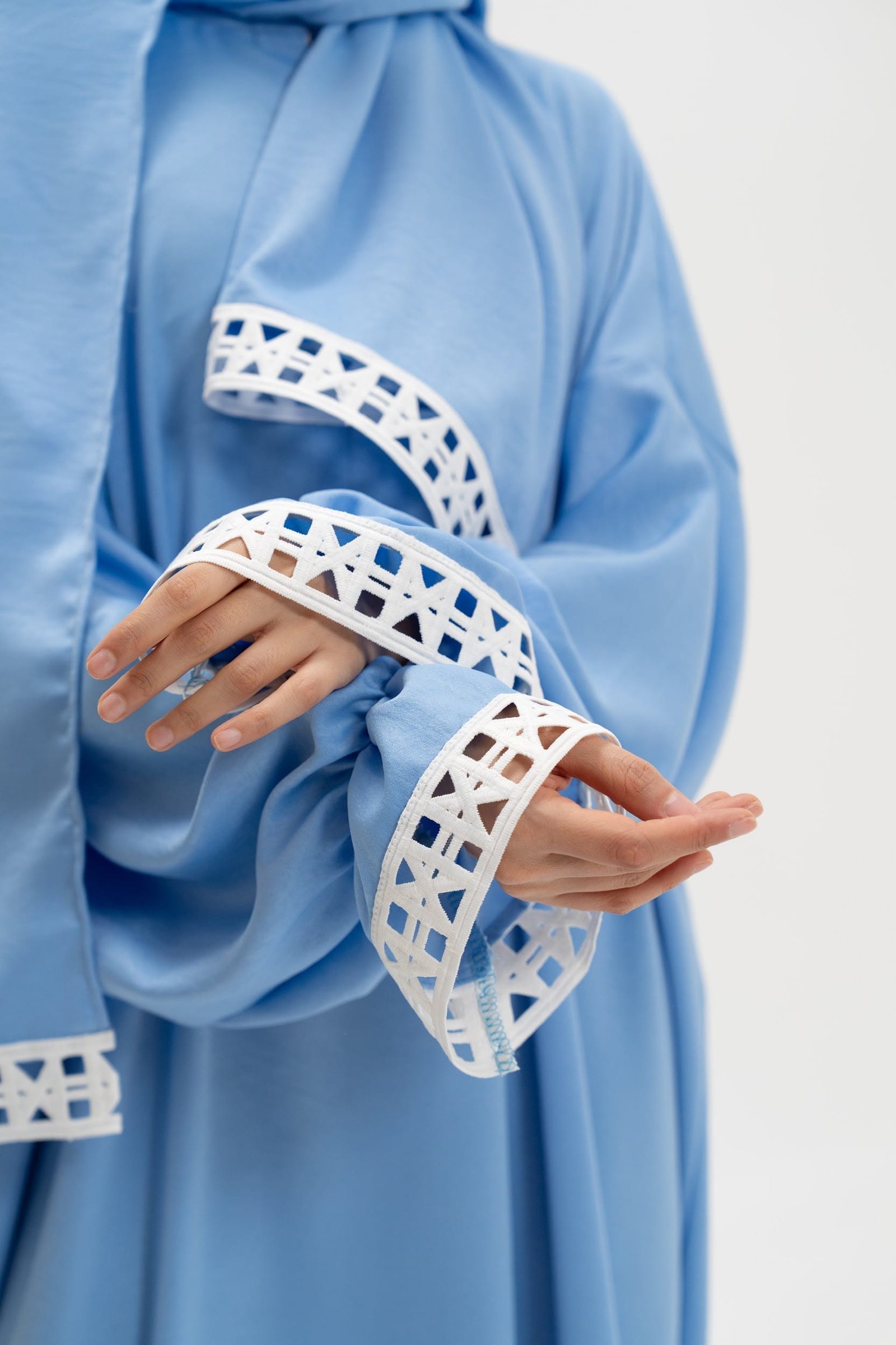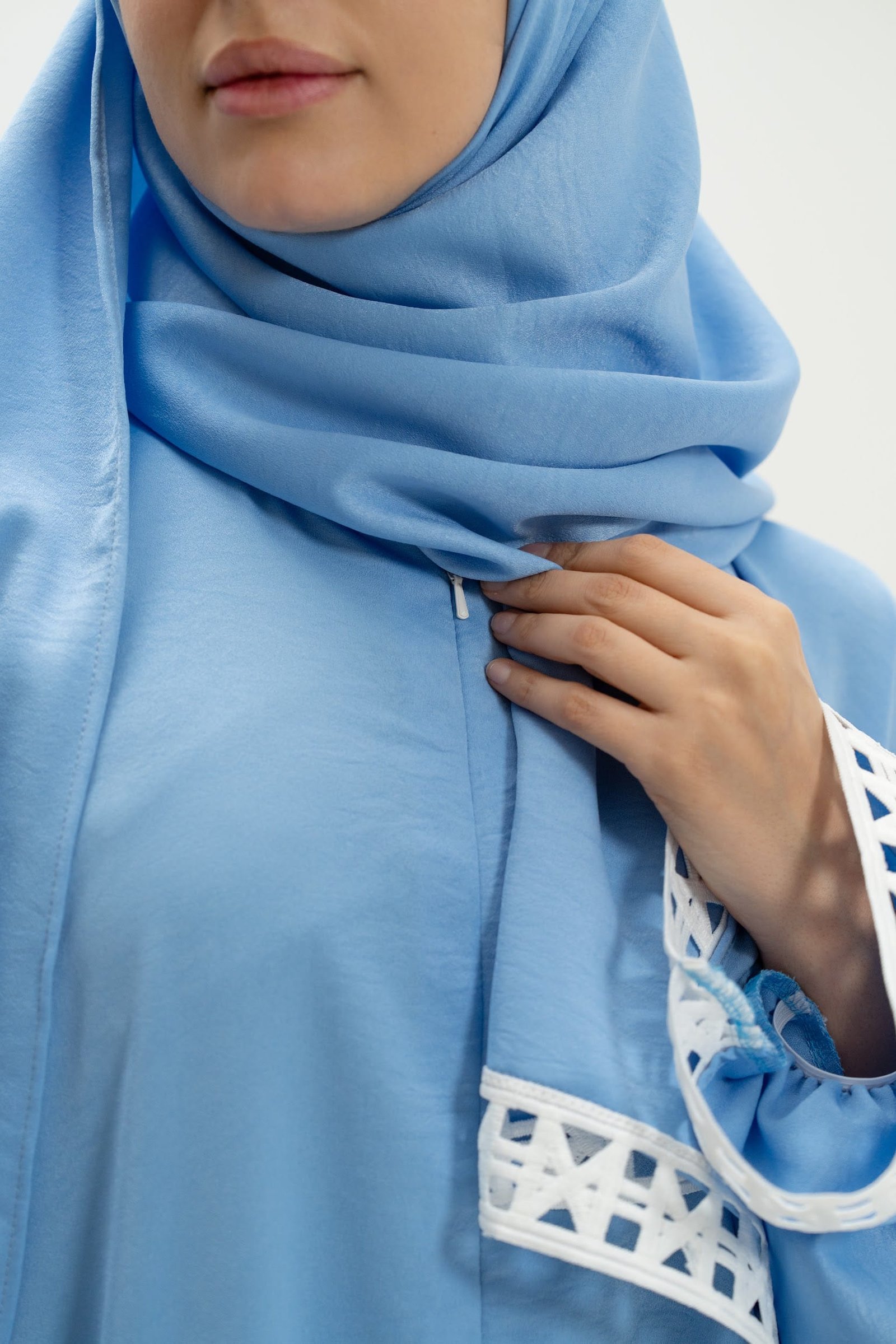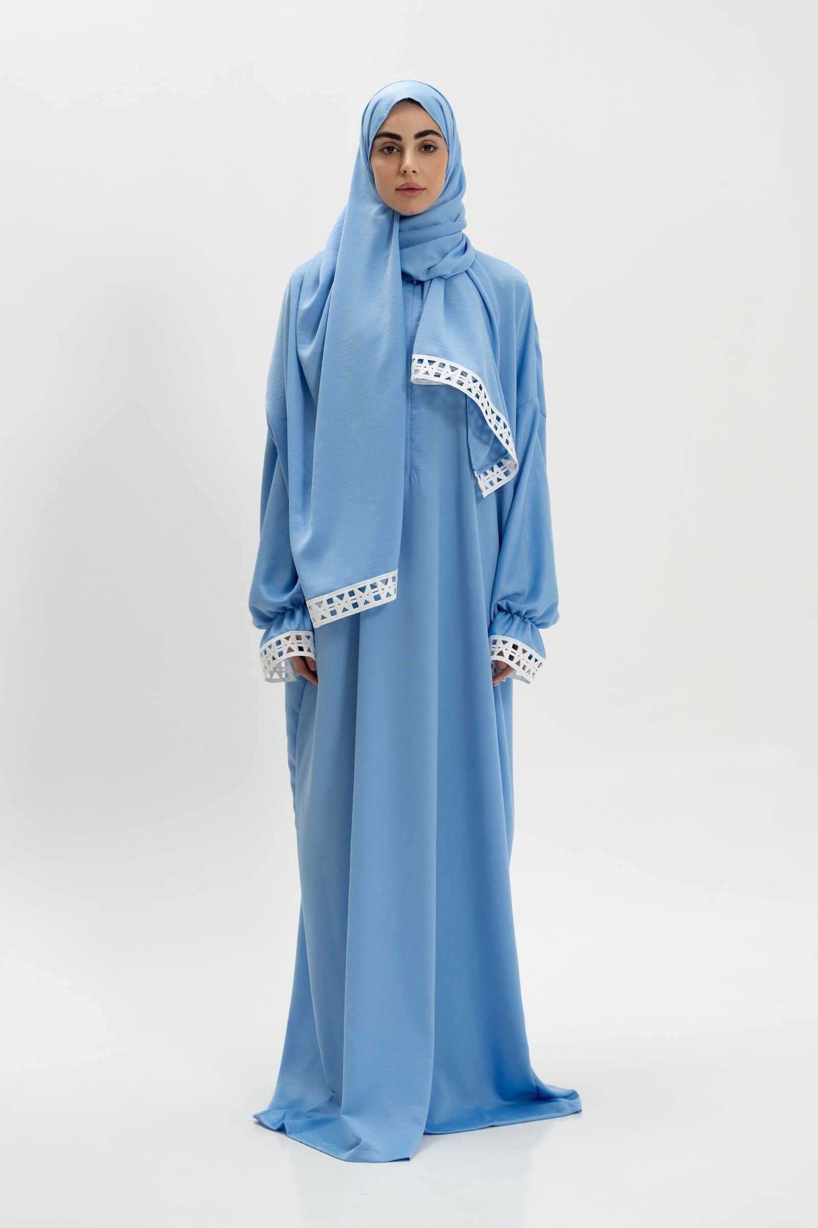 The dress features an attached hijab for convenience and a reliable Japanese zipper system. Traditional Islamic geometric patterns adorn the fabric, while practical elements like reinforced seams, weighted hems, and hidden pockets enhance functionality.